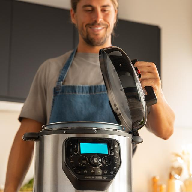 Olla programable de 6 litros de capacidad con cabezal freidora aire y báscula.